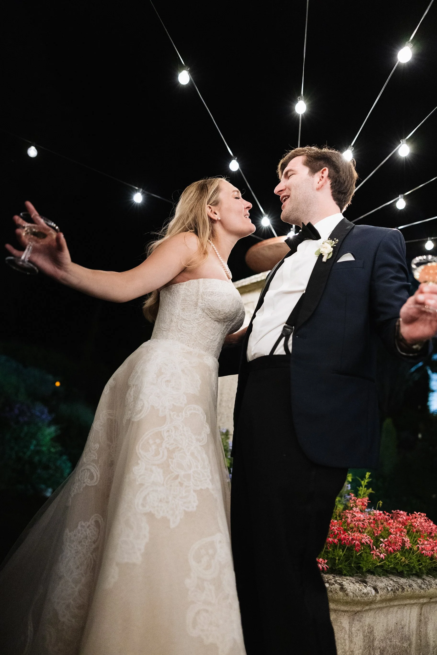 I usually suggest splitting this part of the day into three short sessions rather than one long one. We can start with a quick five-minute session right after your first look or group photos. Then, we’ll take another brief session at sunset, when the light is soft and warm. Finally, a short session later in the evening, using flash, adds a more editorial and lively feel.
